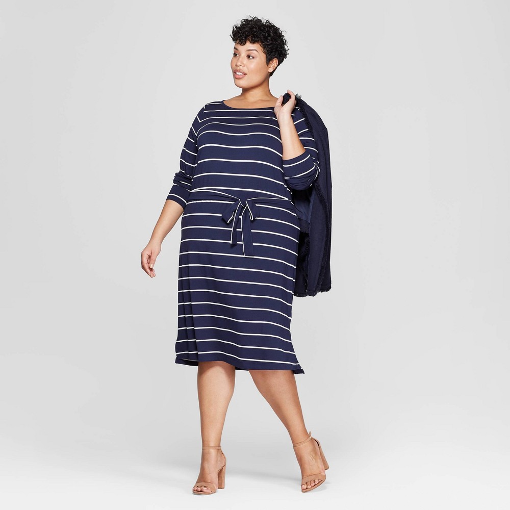 Womens Plus Size Striped Long Sleeve Boat Neck Knit Dress Ava Viv Navywhite 2x Blue