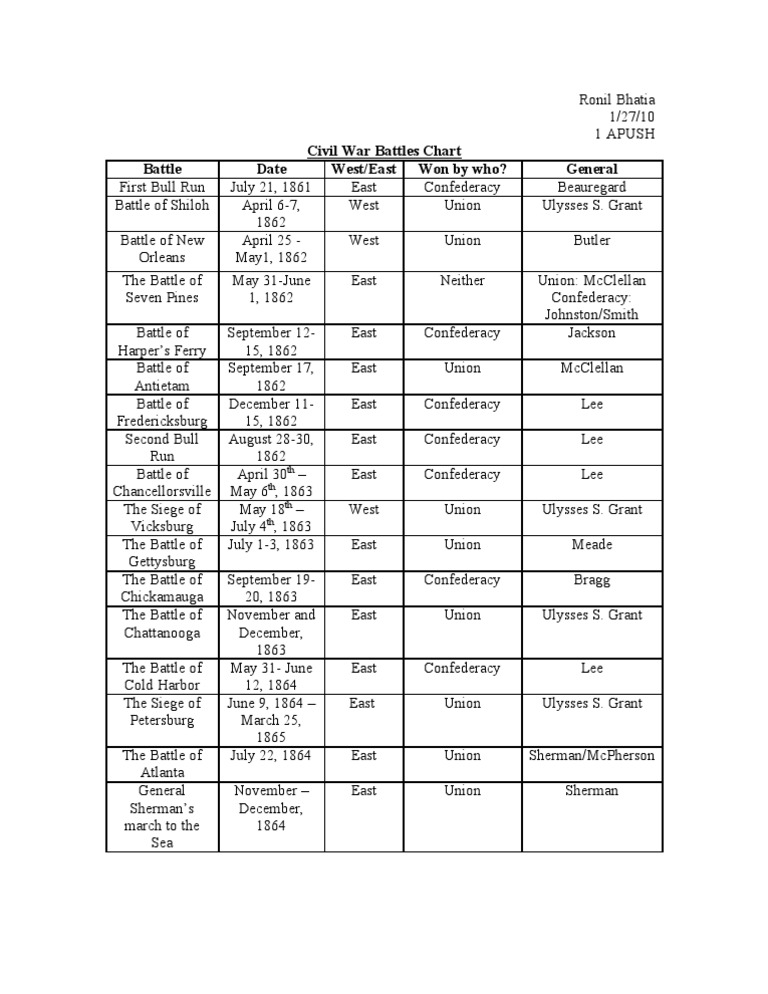 Us History Civil War Battle Chart Part 1 Www Cobblearning Net