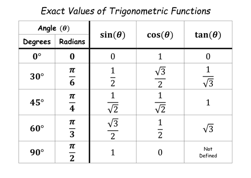 Table Of Exact Values Of Trigonometric Functions Teaching Resources