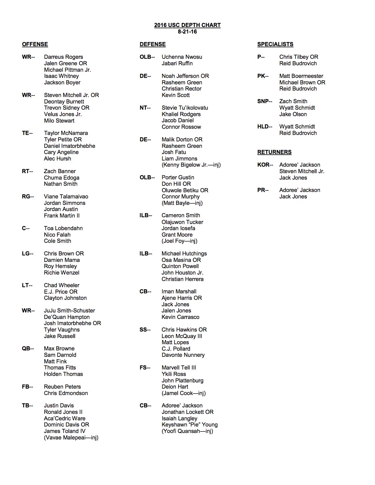 Usc Depth Chart Projecting 2016 Starting Lineup After Fall Camp